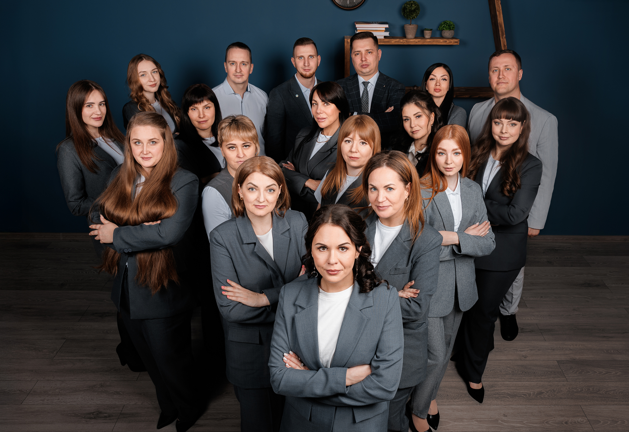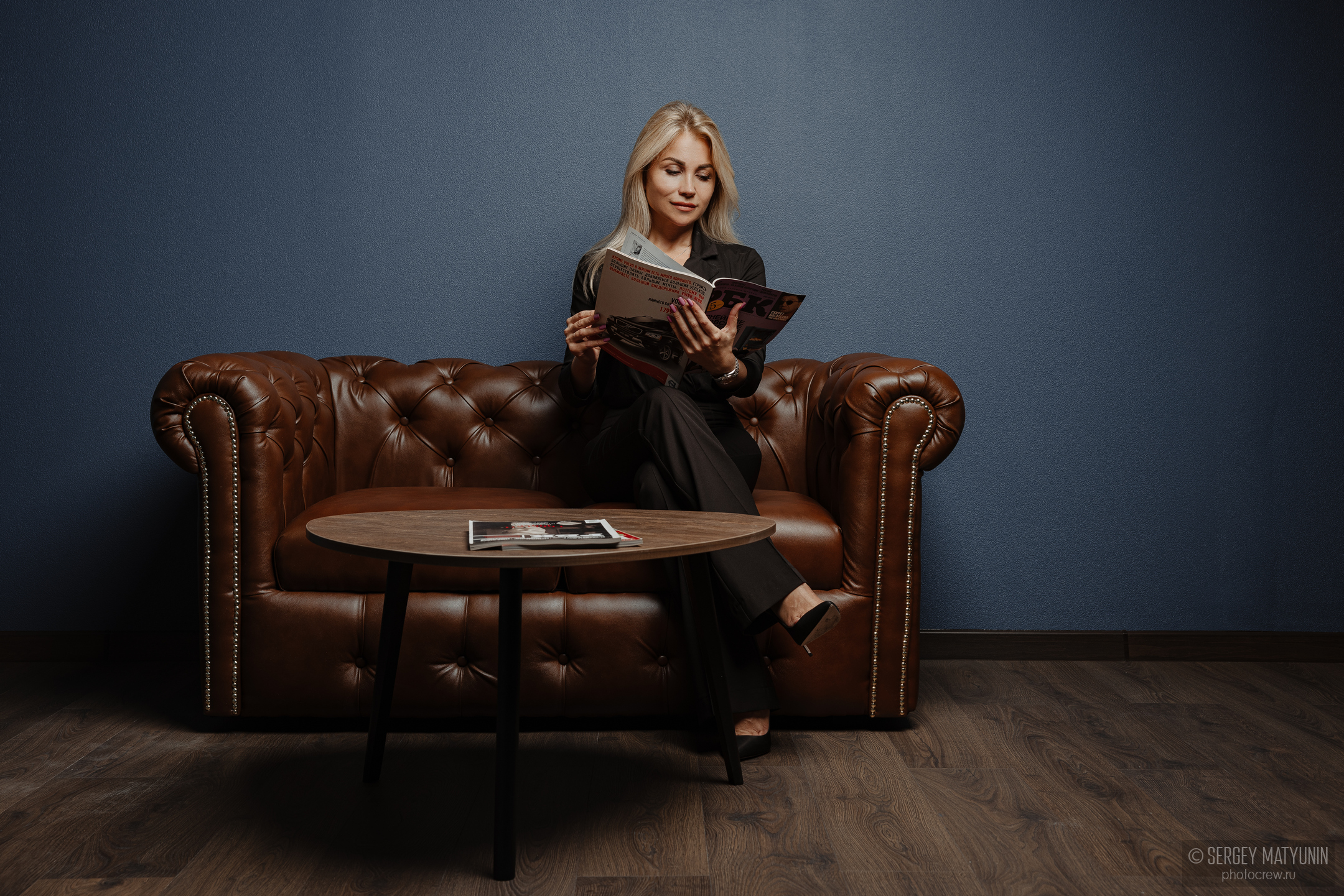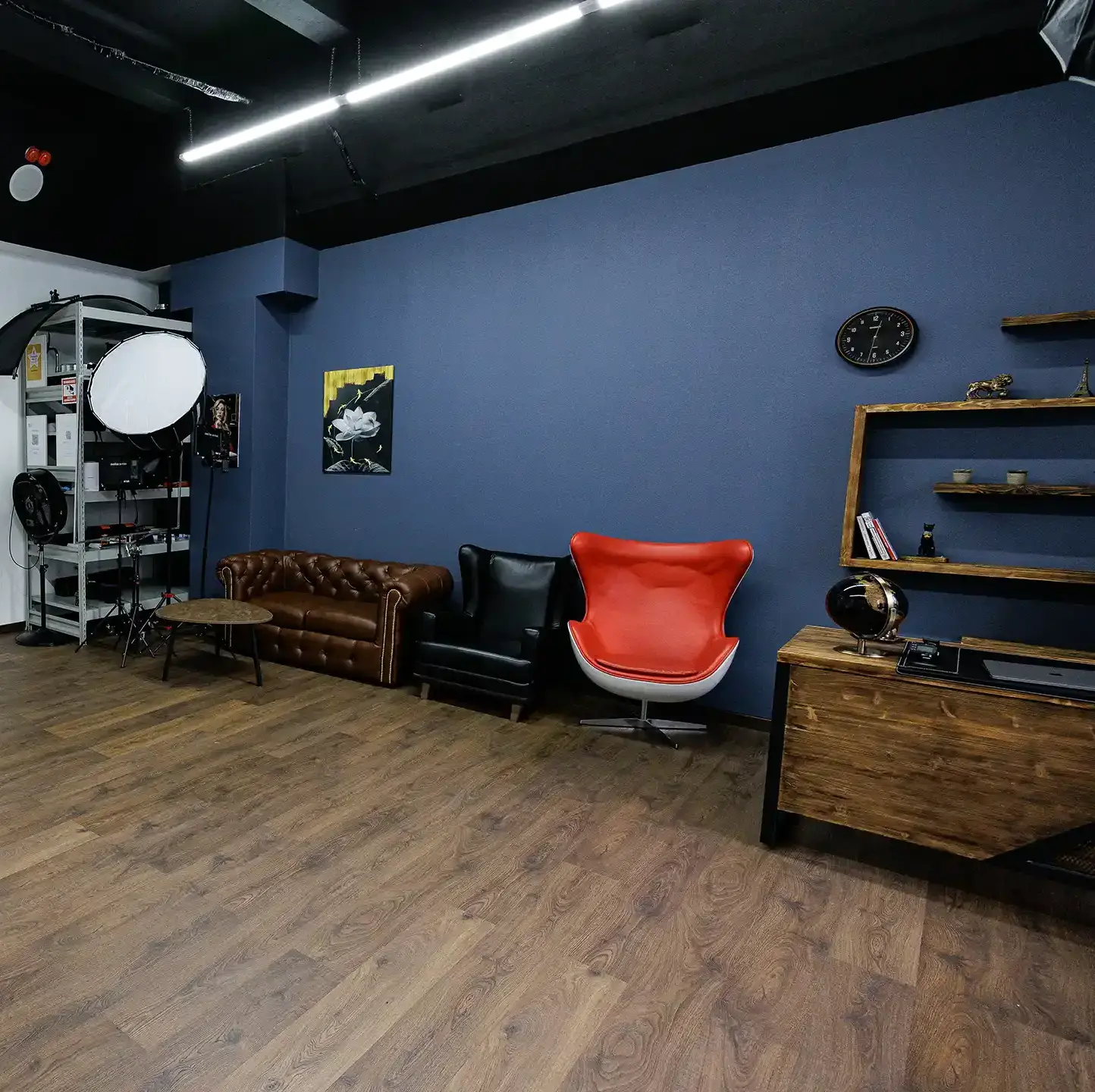 В студии один зал, который включает в себя три зоны: фоновая зона (строгие цвета: черный, белый, серый, синий и коричневый) и две зоны в деловом стиле, представляющие собой интерьеры офисов.